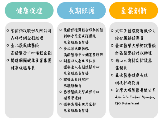 長期照護:愛齡照護勞動合作社附設到咖手居家照護團隊 居家服務員督導、臺北榮民總醫院 高齡醫學中心個案管理師、財團法人臺北市私立恆安老人長期照護中心 居家服務員督導、聯順居家護理所 照顧服務員、慈濟醫院失智共照中心 個案管理員、恆安集團臺北居家部 居家服務於督導